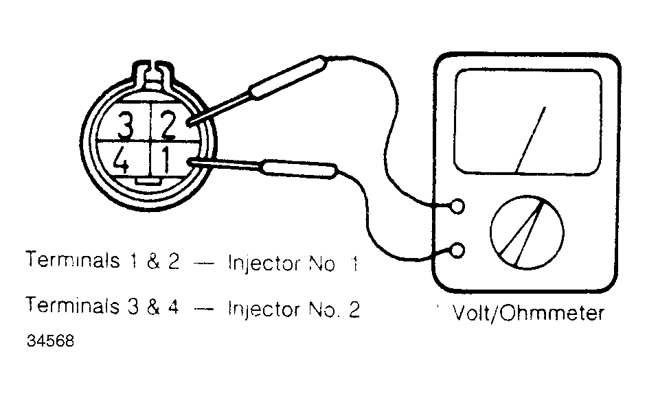 Unplug connector of the injector harness. Using a volt/ohmmeter, test continuity of each circuit. See