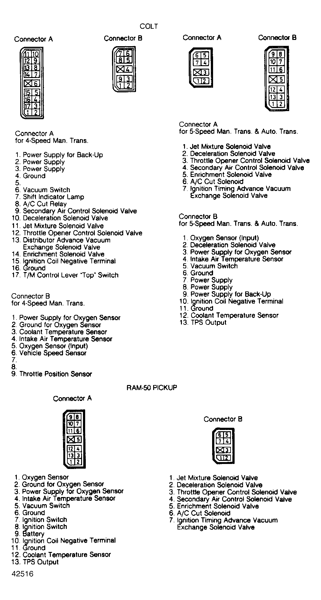 Separate computer terminal connector and identify pin terminal numeration. See Fig 1 through Fig 3 . Use a voltmeter to measure voltage at connector terminal as outlined in the OUTPUT SIGNAL CHARTS. Be sure to verify that the vehicle conditions called for in the charts are observed. Use the charts to interpret the voltage signals to isolate malfunctioning components. Note and record the results.