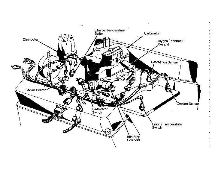 The electronic spark control computer, mounted on the air cleaner, uses up to 7 engine sensors to determine when to fire the spark plugs. See Fig 1. These include the distributor pick-up coils, vacuum transducer, coolant temperature sensor, carburetor switch, detonation sensor, oxygen sensor, and charge temperature switch (if equipped).