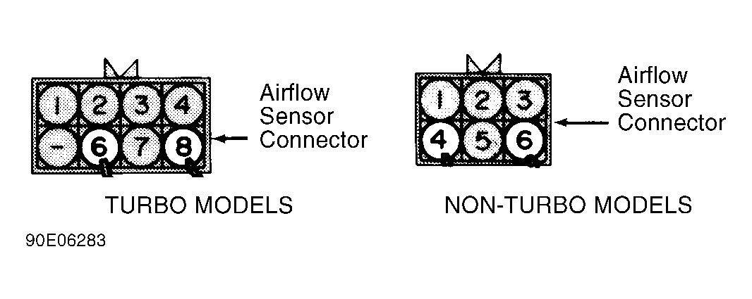 - Airflow sensor is located inside air cleaner assembly. Disconnect airflow sensor electrical connector. Using an ohmmeter, measure resistance between airflow sensor terminals No. 4 and 6 (non-turbo models) or No. 6 and 8 (turbo models). See Fig 1