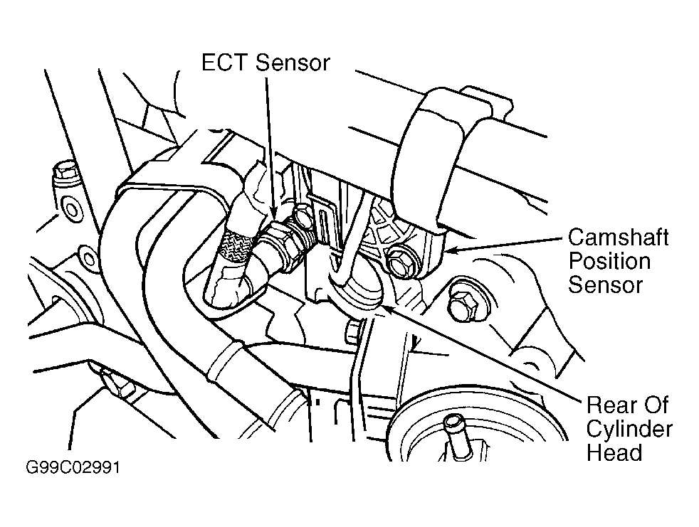 1. Turn ignition on with engine off. Using scan tool, read ENG COOLANT TMP DEG value. If engine coolant temperature is more than 180°F (82°C), allow engine to cool until engine coolant temperature is 150°F (66°C). Start engine. While monitoring engine coolant temperature, allow engine to warm to normal operating temperature, 180°F (82°C). If engine coolant temperature reached 180°F (82°C) or more, go to next step. If engine coolant temperature does not reach 180°F (82°C) or more, replace Engine Coolant Temperature (ECT) sensor. ECT sensor is screwed into end of cylinder head, just above the flywheel and contains Black/Light Blue wire and Tan/Black wires in the connector. See Fig 1. Perform TEST VER-5A .