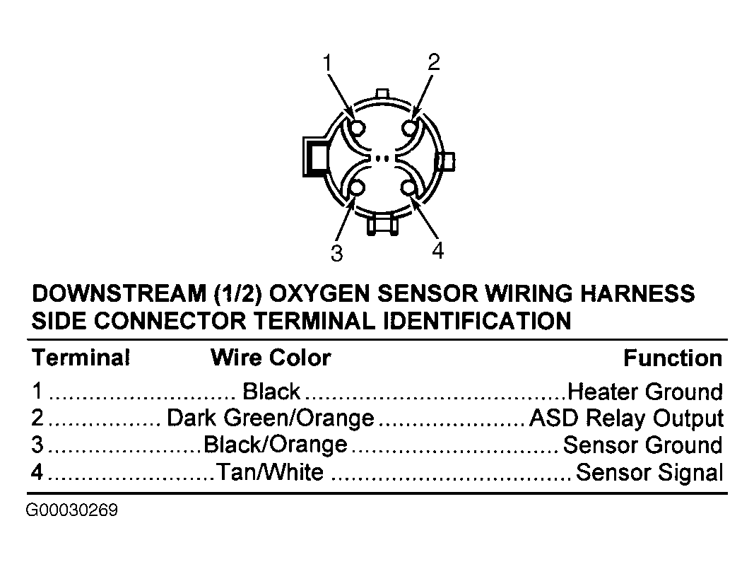 - Ensure 1/2 HO2S is still disconnected. Turn ignition on. Using scan tool, actuate O2 HEATER TEST. Measure voltage between ground and ASD relay output circuit (Dark Green/Orange wire) at 1/2 HO2S harness connector. If voltage is more than 11 volts, go to next step. If voltage is 11 volts or less, repair open in ASD relay output circuit.