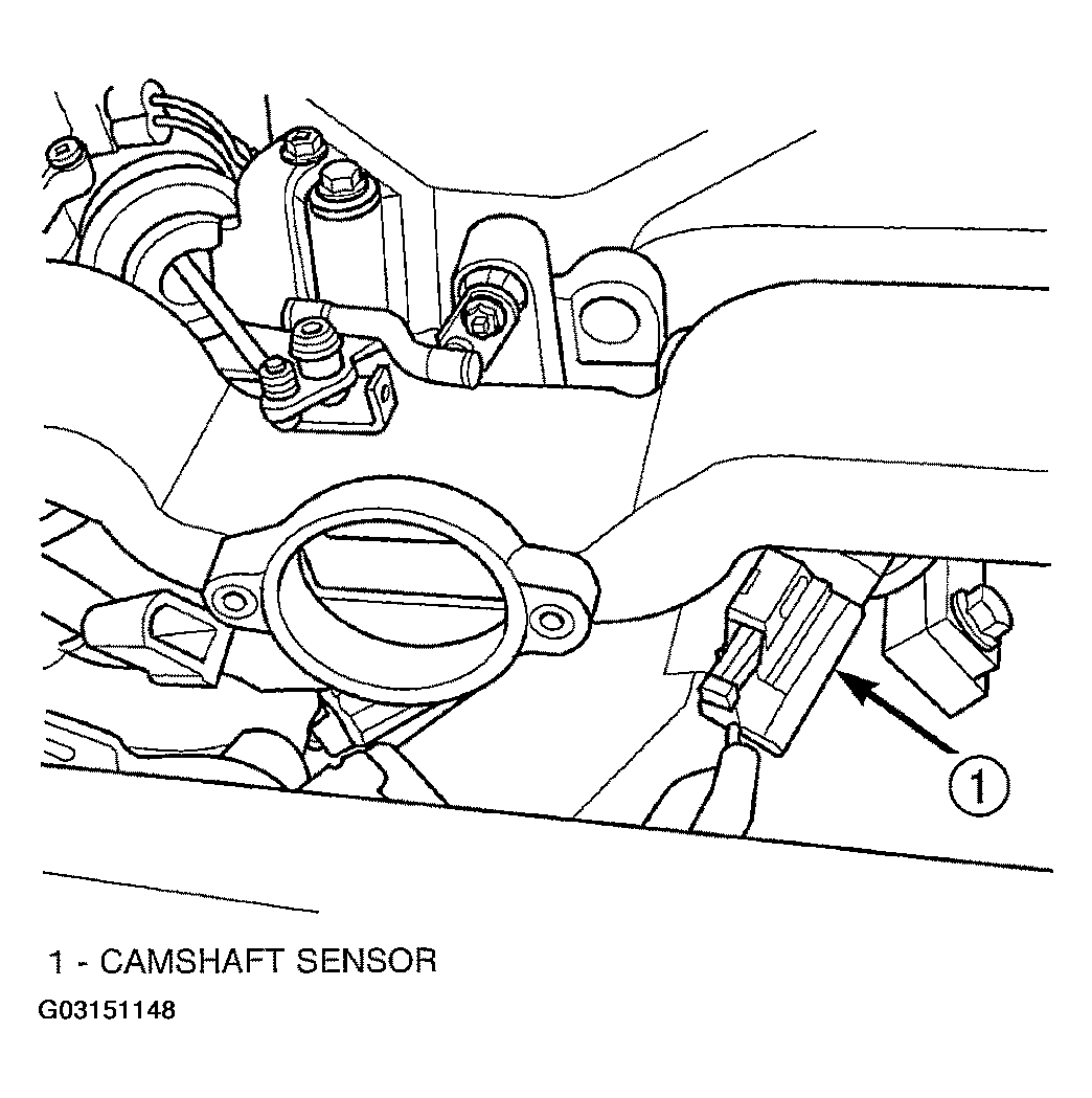 The camshaft position sensor is installed in the timing belt housing cover above the left camshaft sprocket (see Fig 1 ).