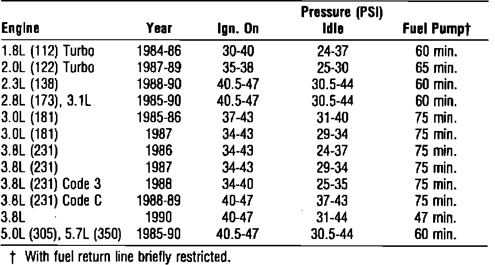 All models with TBI, pressure measured at fuel inlet of TBI unit.