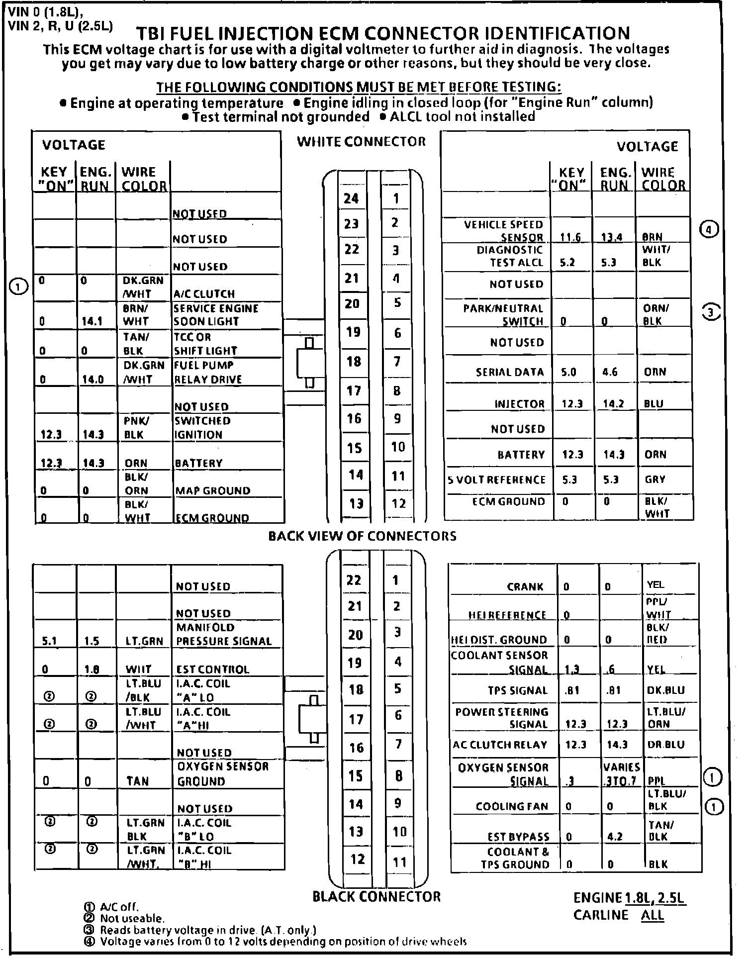 Fig. 006 ECM Connector Terminal I.D. & Volt. Specifications: