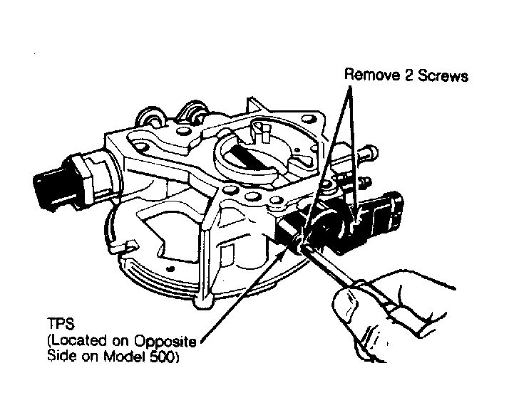 - Invert throttle body assembly and place on clean, flat surface. Remove and discard 2 TPS attaching screws, lock washers and retainers. Remove TPS from throttle body. See Fig 1 .