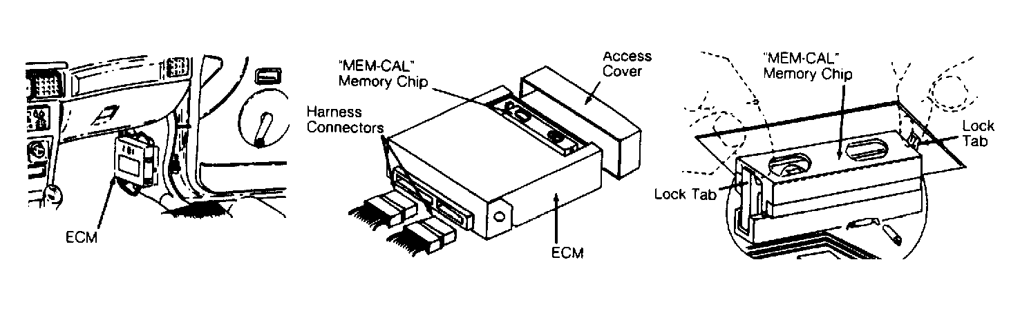 The ECM is similar to one used in various General Motors vehicles. To adapt it to specific applications, each ECM is fitted with a replaceable Memory Calibration (MEM-CAL) chip. See Fig 1 . Manufacturers may update MEM-CAL chips to repair driveability problems. Replacement ECM's often are delivered without MEM-CAL chip installed.