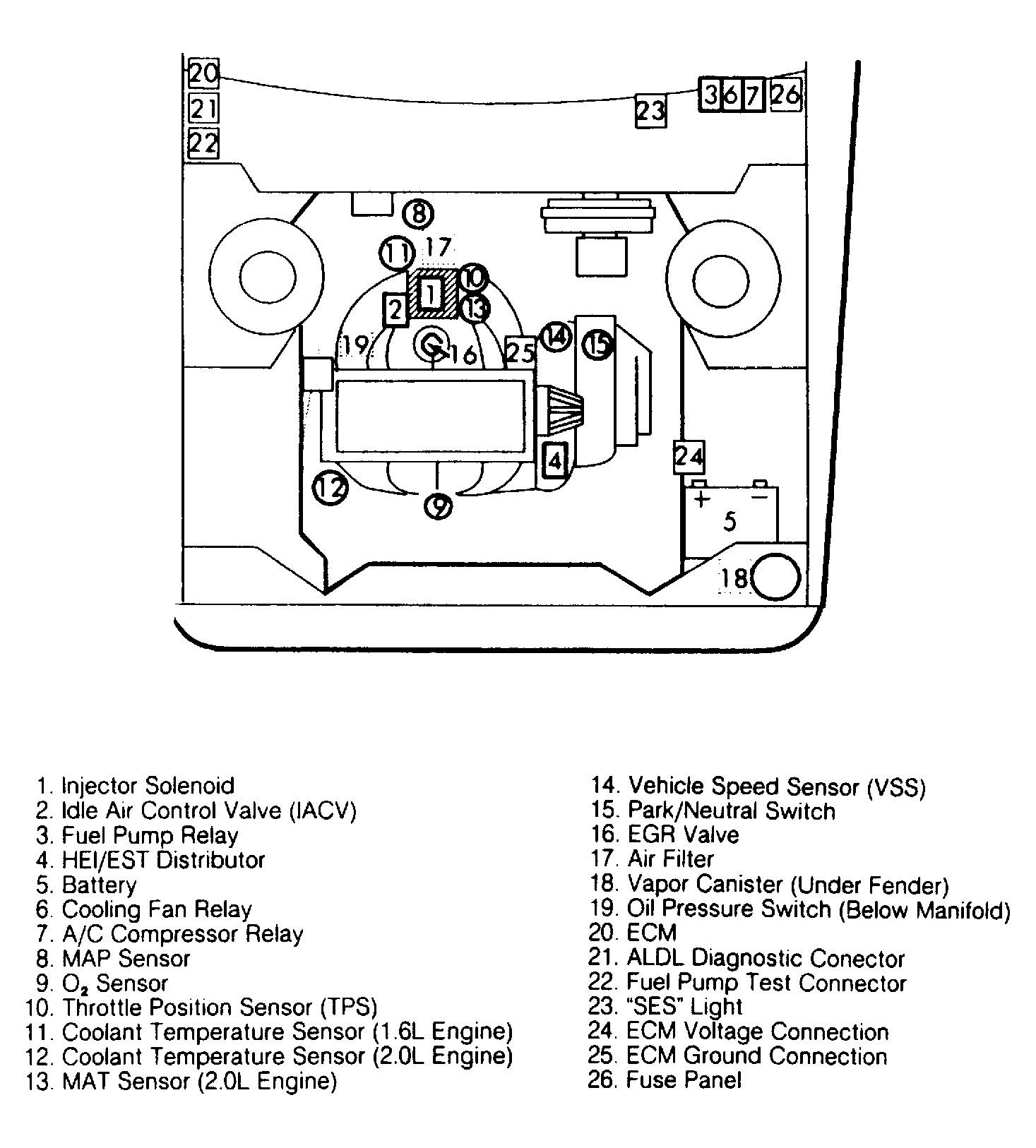 - If battery voltage is not present, check fuse No. F10 (20-Amp) in fuse panel. See Fig 1 . If fuse is okay, check for an open in Red/White/Black wire between fuse panel and ECM terminal connector A6. If wire okay, check for defective ignition switch.