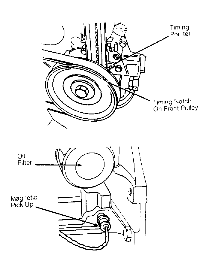 - To set base timing, a magnetic type pick-up may also be used. Install timing probe in engine block, just below oil filter. See Fig 2 . With engine at normal idle, set timing to 10 degrees BTDC. Rotate distributor base to adjust (if necessary).