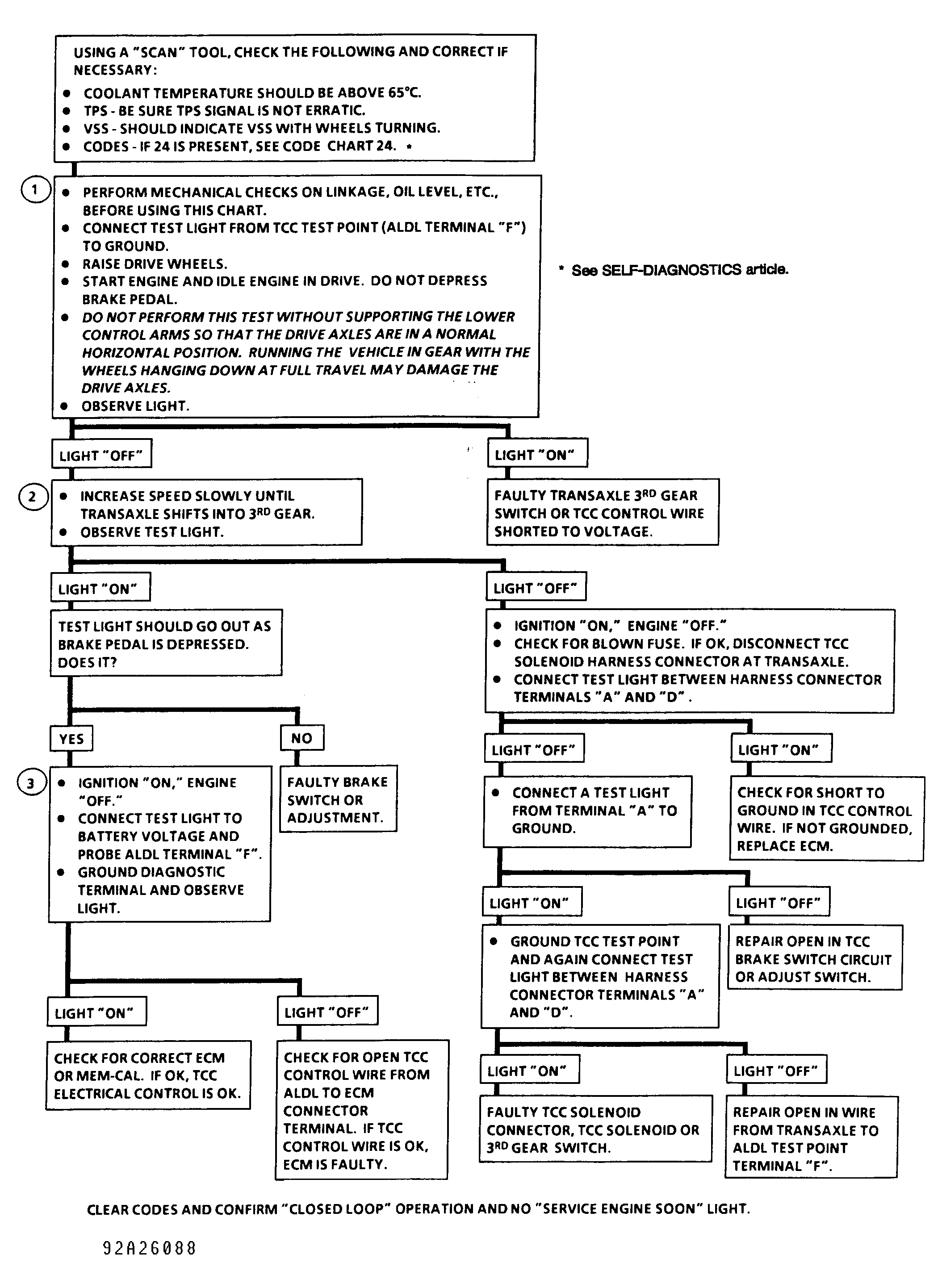 perform TCC diagnosis without supporting the lower control arms so that the drive axles are in a normal horizontal position. Running the vehicle in gear with the wheels hanging down at full travel may damage the drive axles.