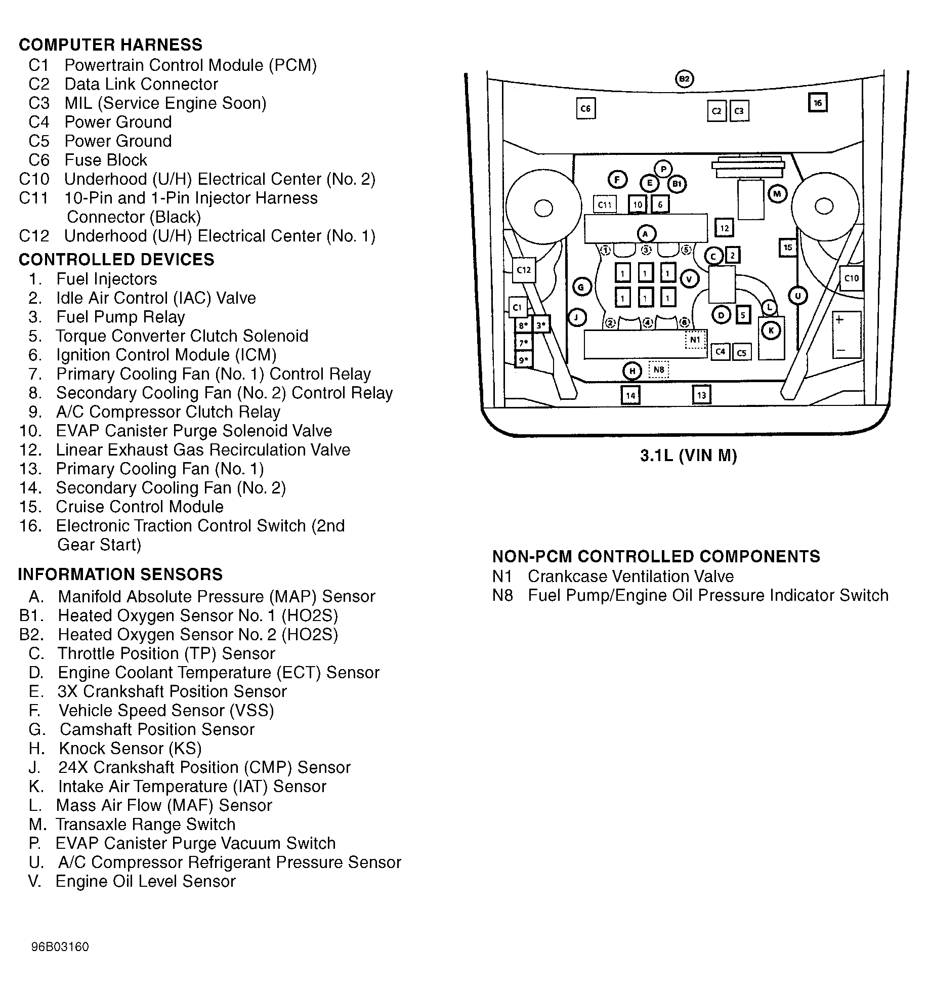 | Underhood Electrical Center No. 1 (3.1L VIN M) | Forward of right front strut tower. See Figure. |