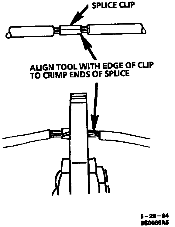 Crimp the splice again, once on each end. Do not let the crimping tool extend beyond the edge of the clip or you may damage or nick the wires.