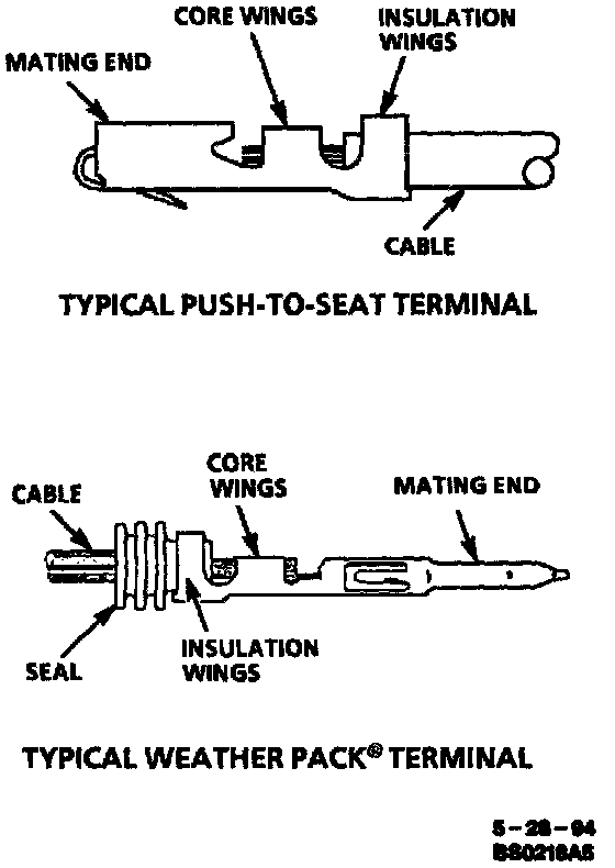 Hand crimp insulation wings (non-Weather Pack(R)). Hand crimp insulation wings around seal and cable (Weather Pack(R)).