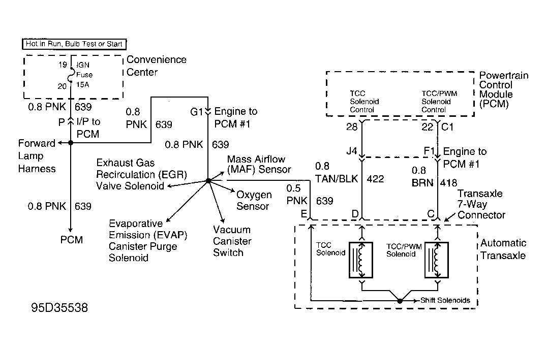 - Connect a test light to battery voltage. Touch TCC control driver terminal with test light. See Figure . Accelerate vehicle to 45 MPH and note test light. If test light does not illuminate, problem is a faulty PCM/VCM connector or PCM/VCM. On some models, lock-up signal may be checked at Data Link Connector (DLC) terminal "F" instead of at PCM/VCM terminal.