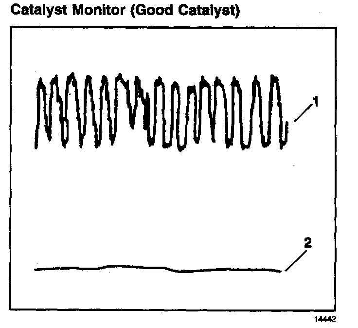 A good TWC catalyst will show a very active output voltage on the pre-catalyst heated oxygen sensor (1).