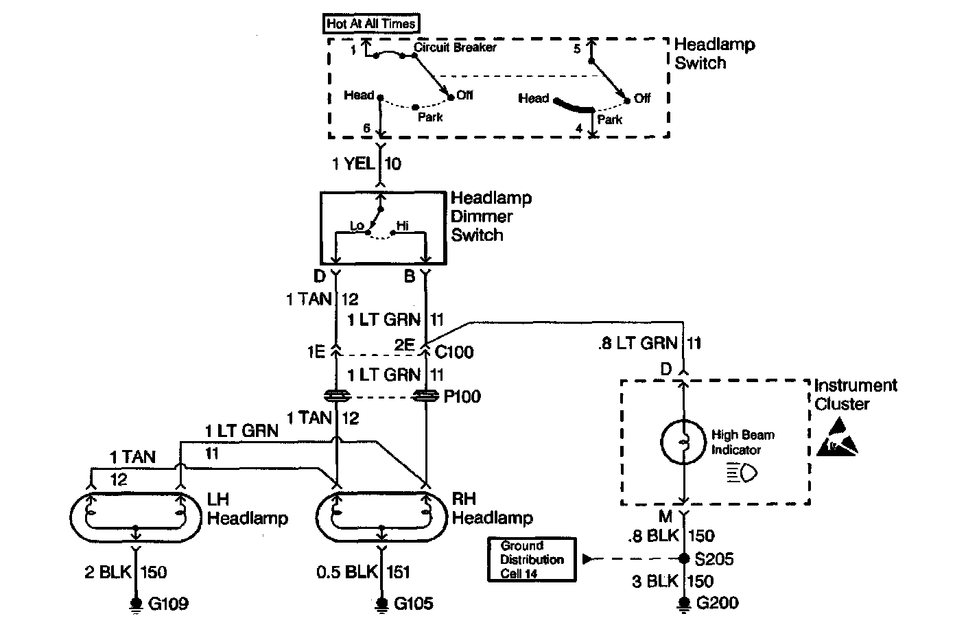 At this point analyze and (diagnose the problem), and develop text. Since the high beam indicator illuminated when the headlamp dimmer switch was in the high position, the high contacts of the headlamp dimmer switch and the LT GRN wire between the headlamp dimmer switch and C100 are good.