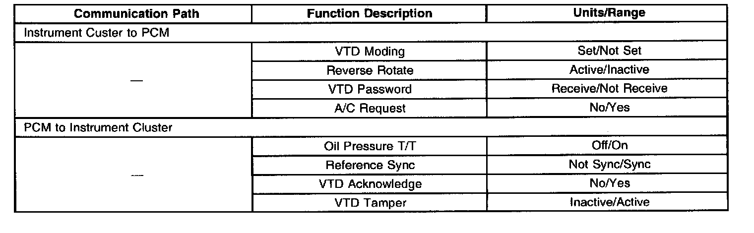 REFERENCE SYNC: The Reference Sync function tells the instrument cluster if the engine is cranking. VTD Acknowledge: The PCM outputs the VTD Acknowledge function if the Pass-Theft condition is present for the ignition cycle.