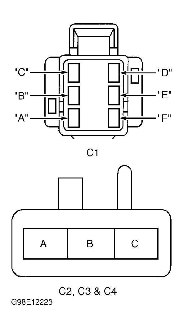 3. Turn ignition off. Disconnect seat adjuster motor connector C2, C3 and C4. See Figure . Turn ignition on. Using DVOM, measure voltage between ground and Purple wire connector terminal of seat adjuster motor connector while moving power seat switch. If voltage is 4.0-5.2 volts, go to next step. If voltage is not 4.0-5.2 volts, go to step  5 .