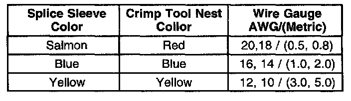 Use crimp and seal splice sleeves to form a one-to-one splice on all types of insulation except tefzel and coaxial to form a one-to-one splice. Use tefzel and coaxial where there is special requirements such as moisture sealing. Follow the instructions below in order to splice copper wire using crimp and seal splice sleeves.Crimp and Seal Splice Table: