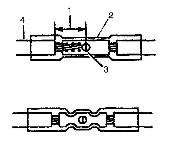 9. Insert the wires into the splice sleeve until the wire hits the barrel stop. The splice sleeve has a stop in the middle of the barrel in order to prevent the wire from passing through the splice (3).