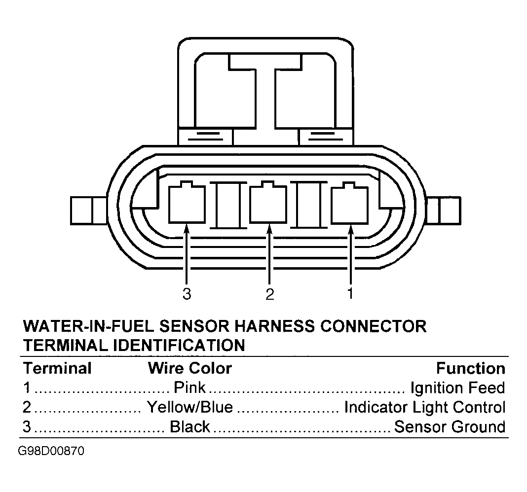 - Check for open in ignition feed circuit (Pink wire) between underhood fuse/relay center and water-in-fuel sensor. If problem exists, repair as necessary and go to step 12. If problem does not exist, go to next step.
