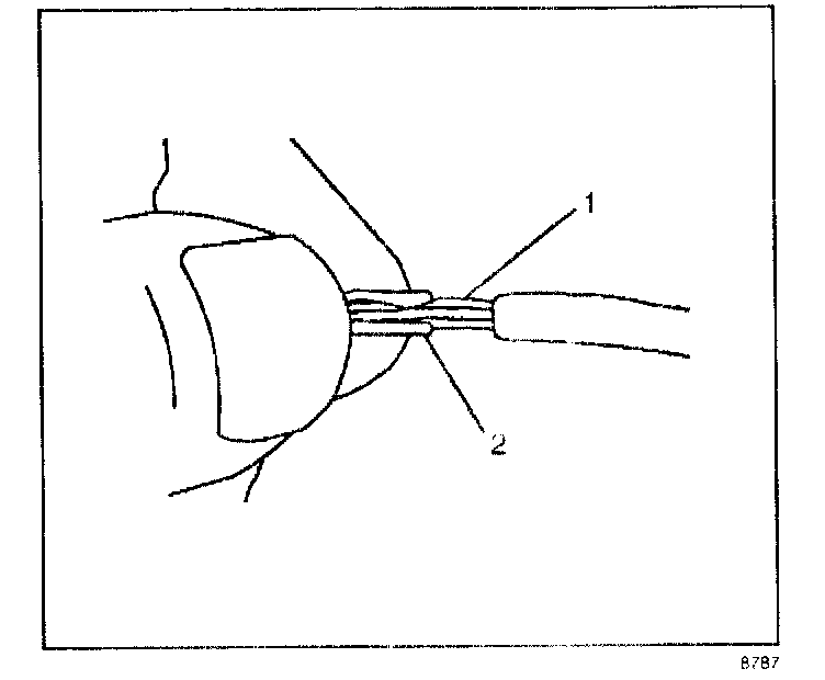 7. Center the splice clip (2) over the stripped wires (1) and hold the clip in place.