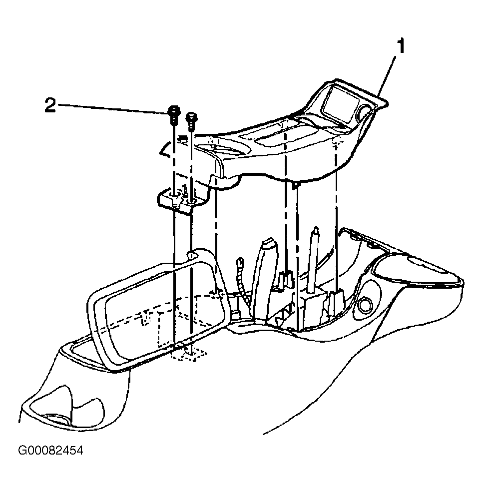 - Insert the forward end of the trim plate (1) into the console. Apply pressure to the console trim plate (1), and snap the trim plate (1) into place. Install the console trim plate bolts (2). Tighten the bolts to 18 INCH lbs. (2 N.m).