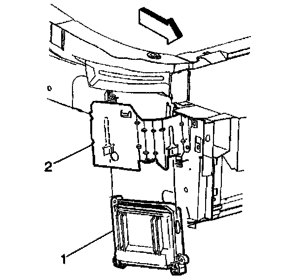 8. Slide the PCM assembly (1) and protective cover (if equipped) from the PCM bracket (2).