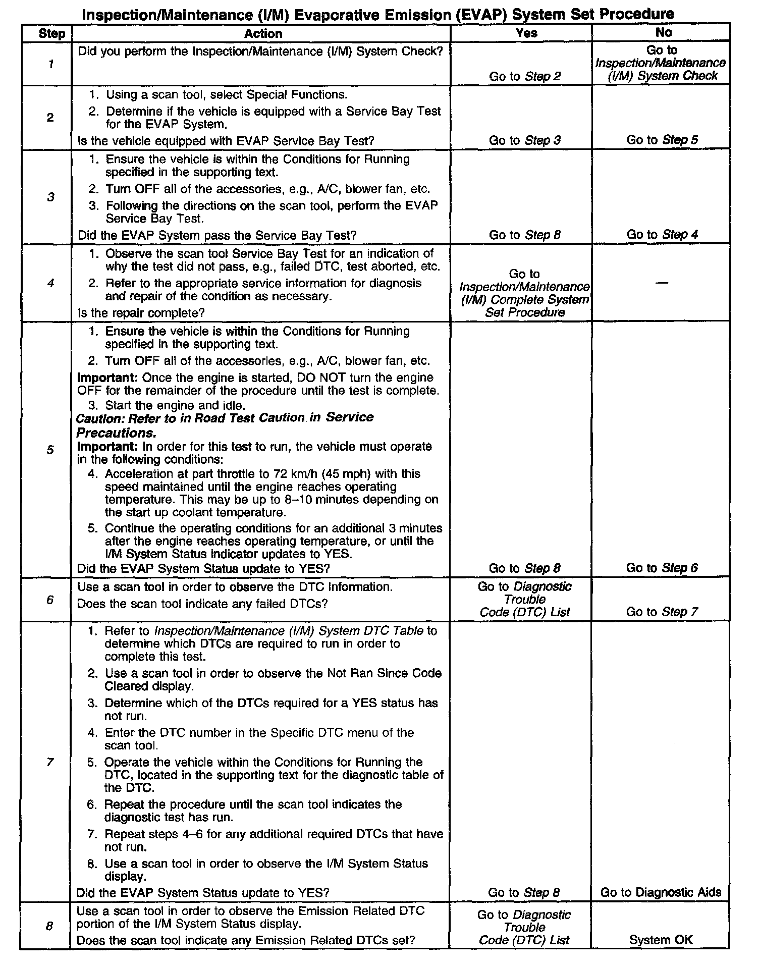 6. This step is to identify a first failure of a type B DTC. A DTC only appears on the I/M System Status display when it becomes a MIL illuminating DTC. This occurs on the second failure of a type B DTC. A first failure of a type B DTC will not allow the I/M System Status to update to YES. Refer to Diagnostic Aids.