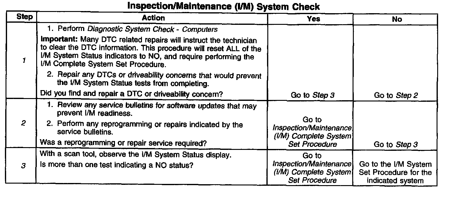1. Any DTCs set, even those that are not listed in the Inspection/Maintenance System DTC Table, may prevent the required DTCs from running. If there is any question as to whether a set DTC is disabling the required I/M diagnostic, review the Conditions for Running in the diagnostic procedures for the DTC required by the I/M diagnostic. A list of disabling DTCs, if applicable, is contained in the supporting text for that DTC.