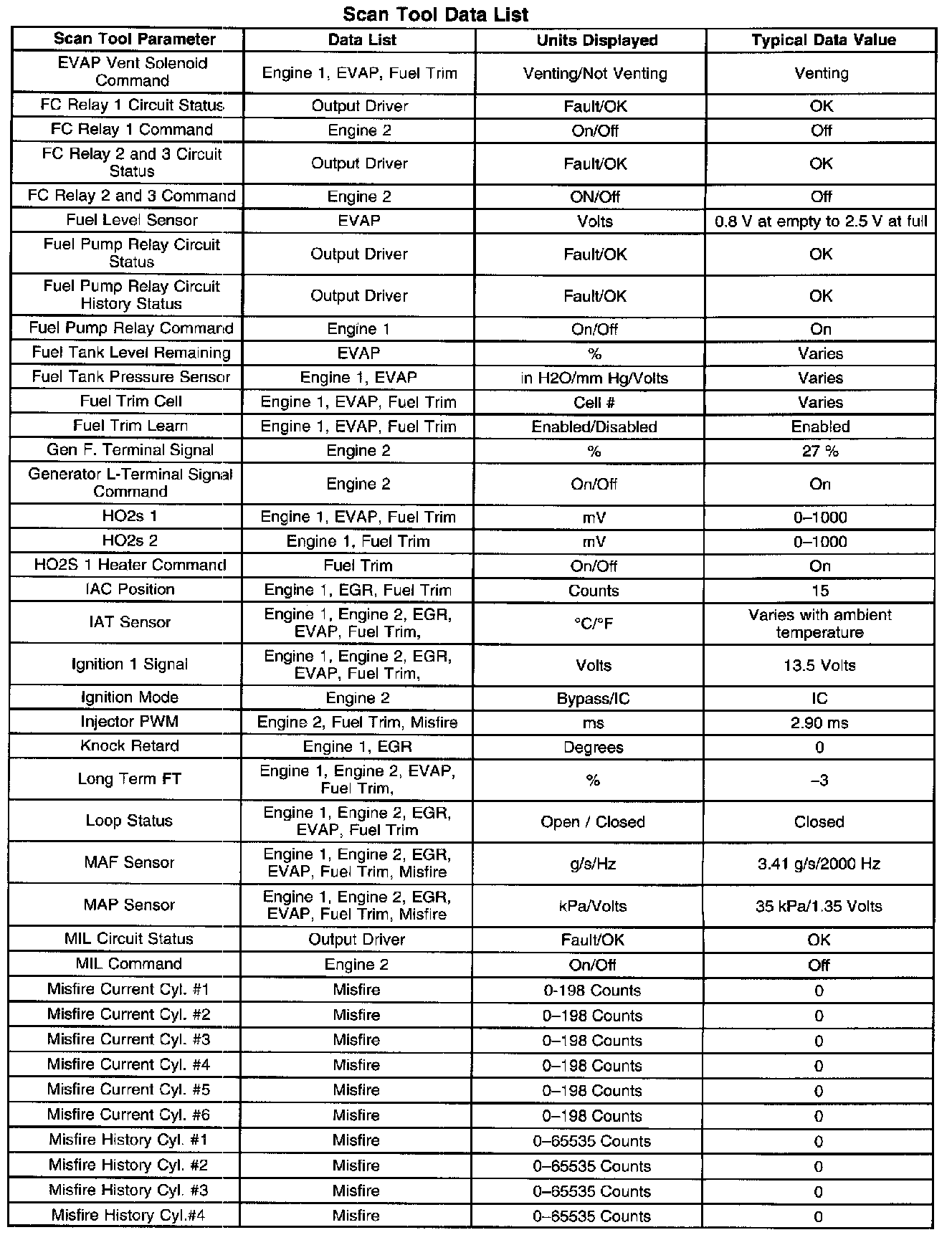 ^ Engine Data 1-Contains general information regarding fuel delivery, intake air control (IAC) position, heated oxygen sensor (HO2S) 1, HO2S 2, and other basic engine operating conditions.