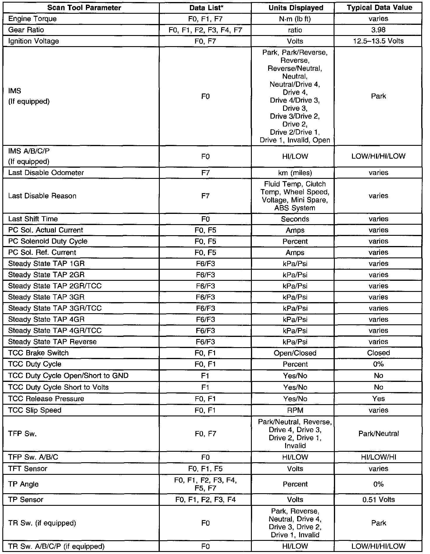 Only the parameters listed below are used for diagnosing. If a scan tool displays other parameters, the values are not recommended by General Motors for use in diagnosis.