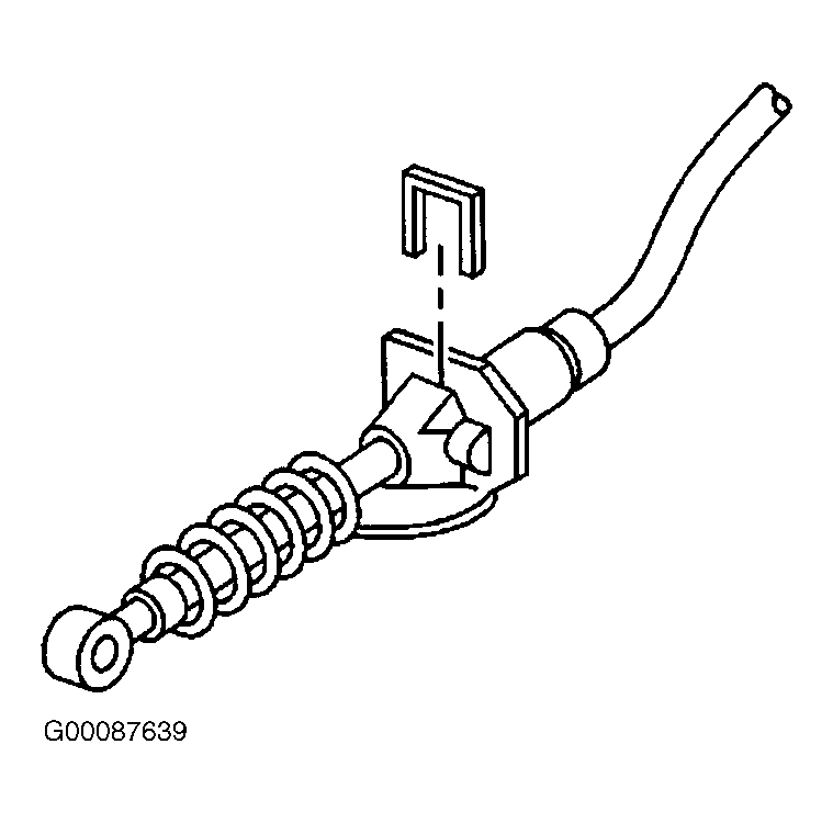 Position the transmission shift control lever into Park. Apply the park brake. Raise and support the vehicle. Position the transmission range selector lever to Park. Rotate the range select lever clockwise until it reaches the full mechanical stop position. Snap the transmission shift cable into the bracket with the cable adjustment button up. Snap the shift cable onto the range selector lever pin. Press cable adjustment button down. Insert the retainer to the shift cable. See Fig 1 . Remove the safety stands. Lower the vehicle.