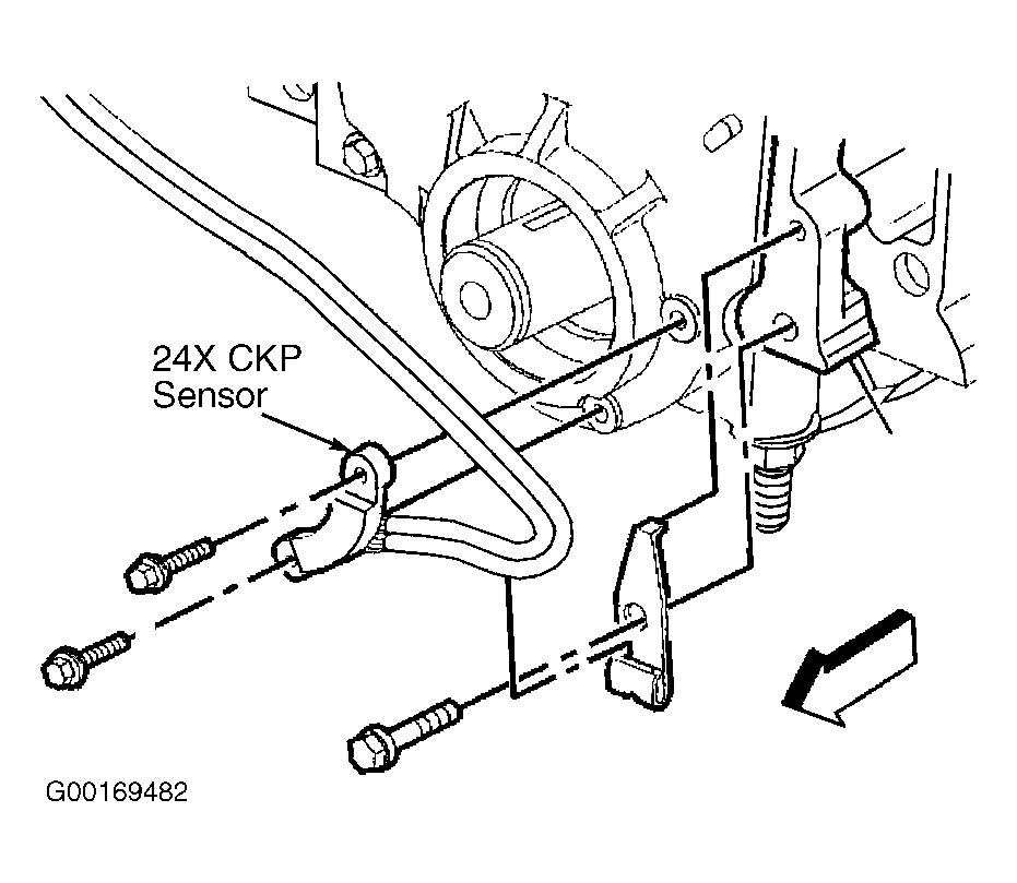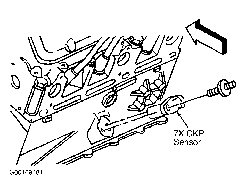 The Crankshaft Position (CKP) sensor utilizes a pick-up coil type sensor. The 7X CKP sensor is located on side of engine block and the 24X CKP sensor is mounted behind the harmonic balancer. See Fig 1 or Fig 2 . The CKP sensor monitors crankshaft position and sends signals to ignition control module. These signals provide PCM with a Top Dead Center (TDC) position reference for each piston, as well as supplying an engine speed (RPM) signal. This allows PCM to fire appropriate ignition coil at the proper time, determine triggering of the fuel injectors, and to compute crankshaft position and RPM. CKP sensor signal may also used to detect a cylinder misfire by monitoring changes in crankshaft speed.