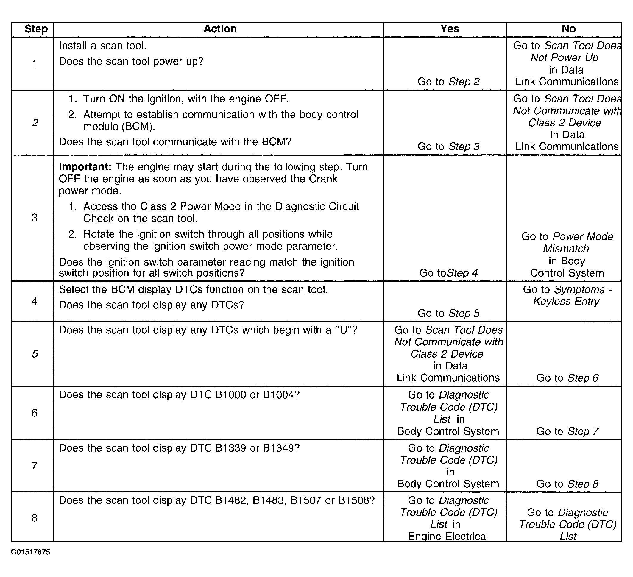 The Keyless Entry Scan Tool Data List contains all of the keyless entry related parameters that are available on the scan tool. The parameters in the list are arranged in alphabetical order. The column, "Data List," indicates the location of the parameter within the scan tool menu selections. Use the Keyless Entry Scan Tool Data List as directed by a diagnostic table or in order to supplement the diagnostic procedures. Begin all of the diagnostic procedures with Diagnostic System Check - Remote Keyless Entry, See Figure .