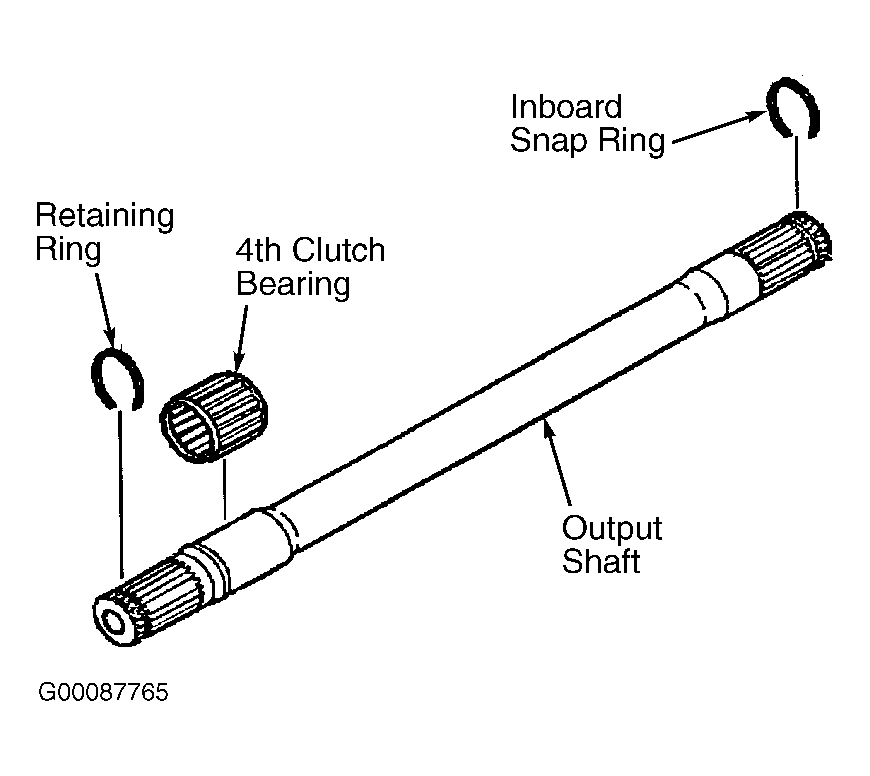 - Install the drive axle retaining ring and the output shaft differential inboard snap ring onto the output shaft. See Figure . Install the fourth clutch bearing onto the output shaft. See Figure .