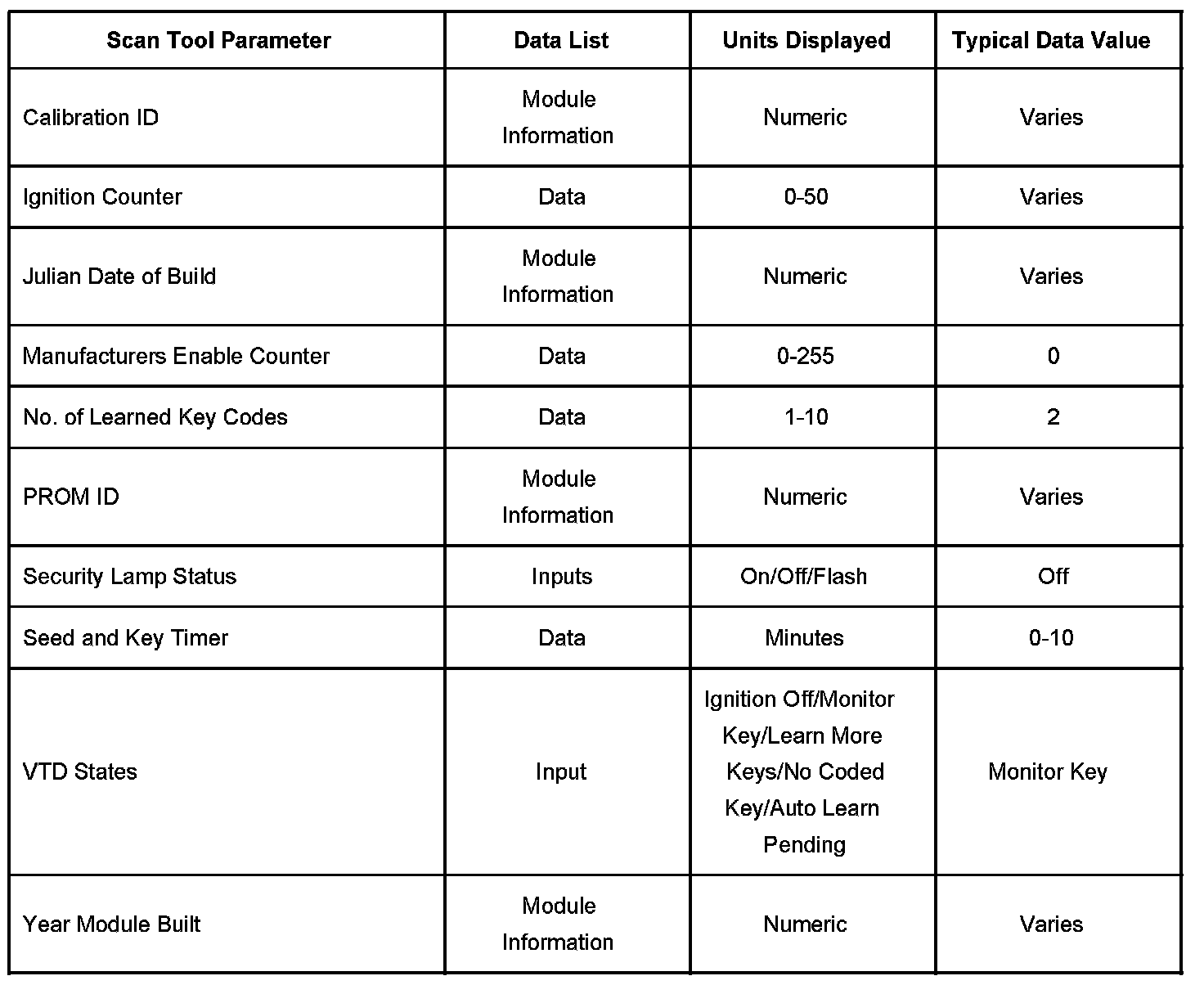 Vehicle Theft Deterrent Scan Tool Data List Part 2: