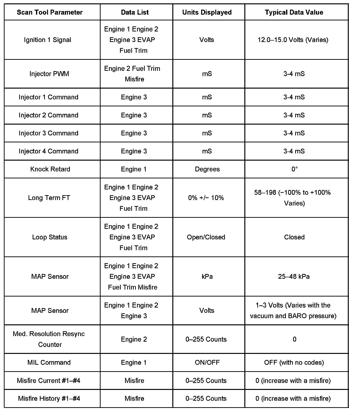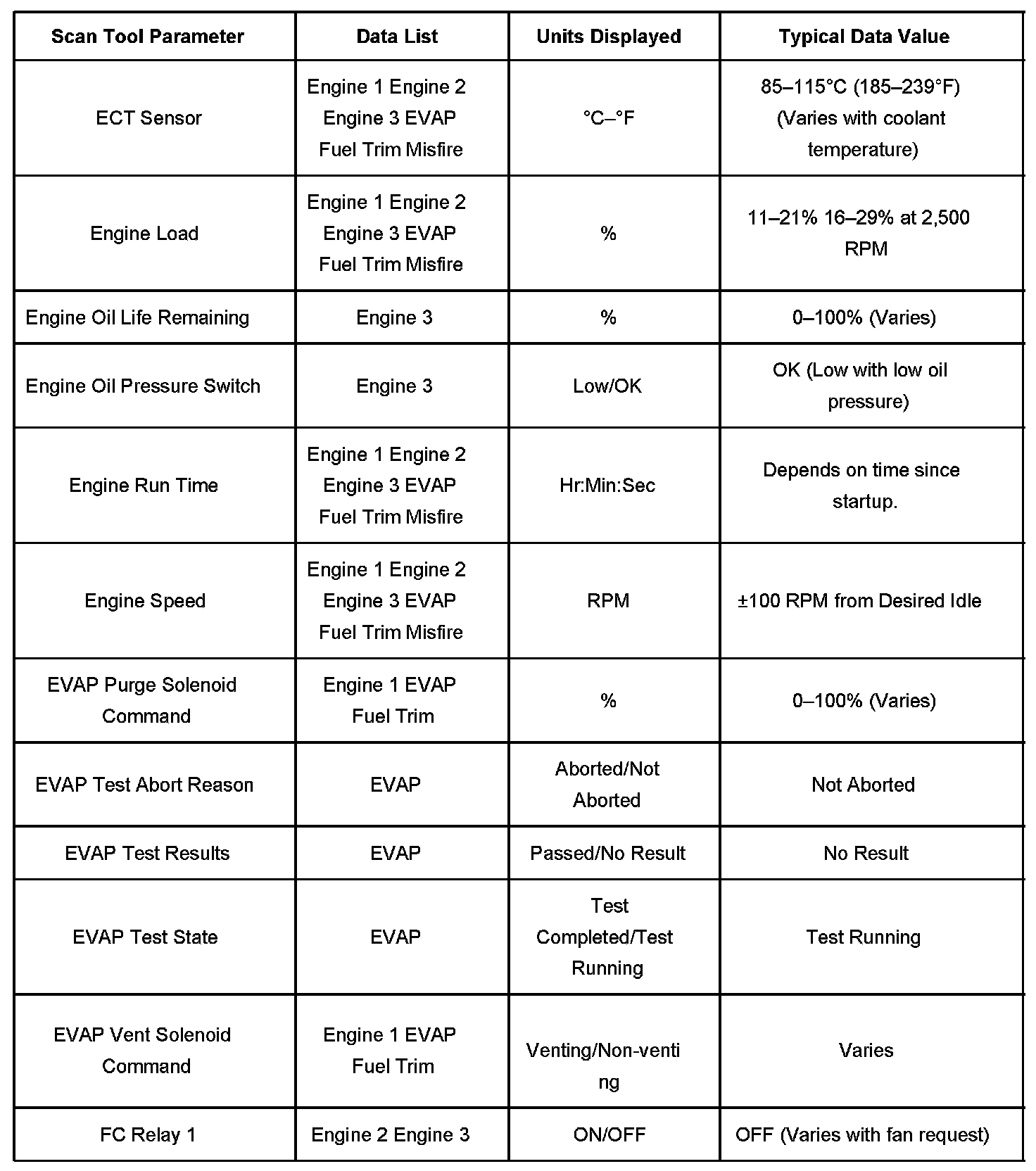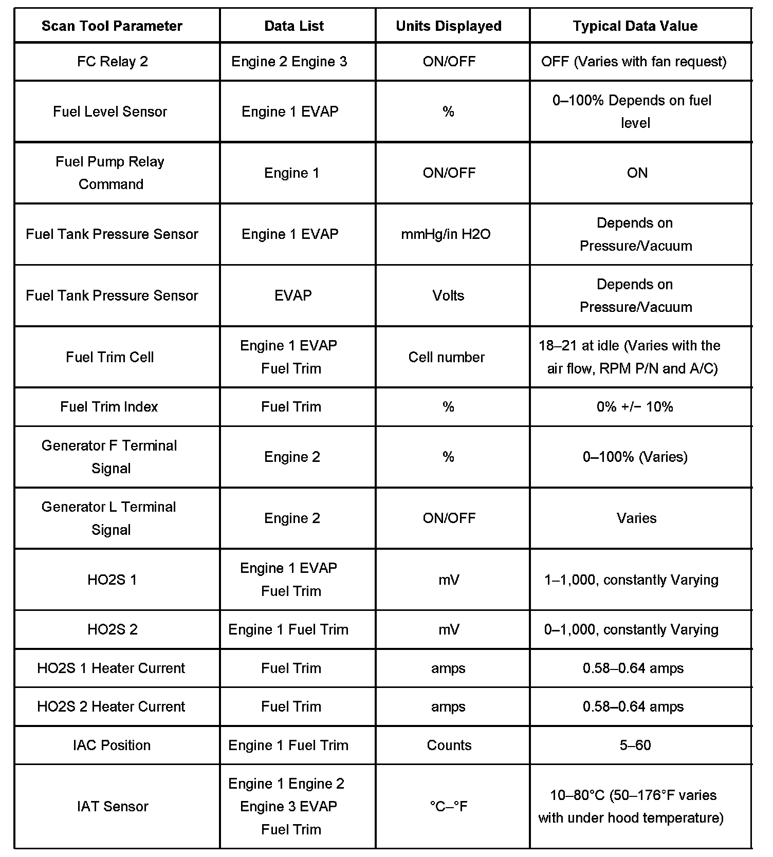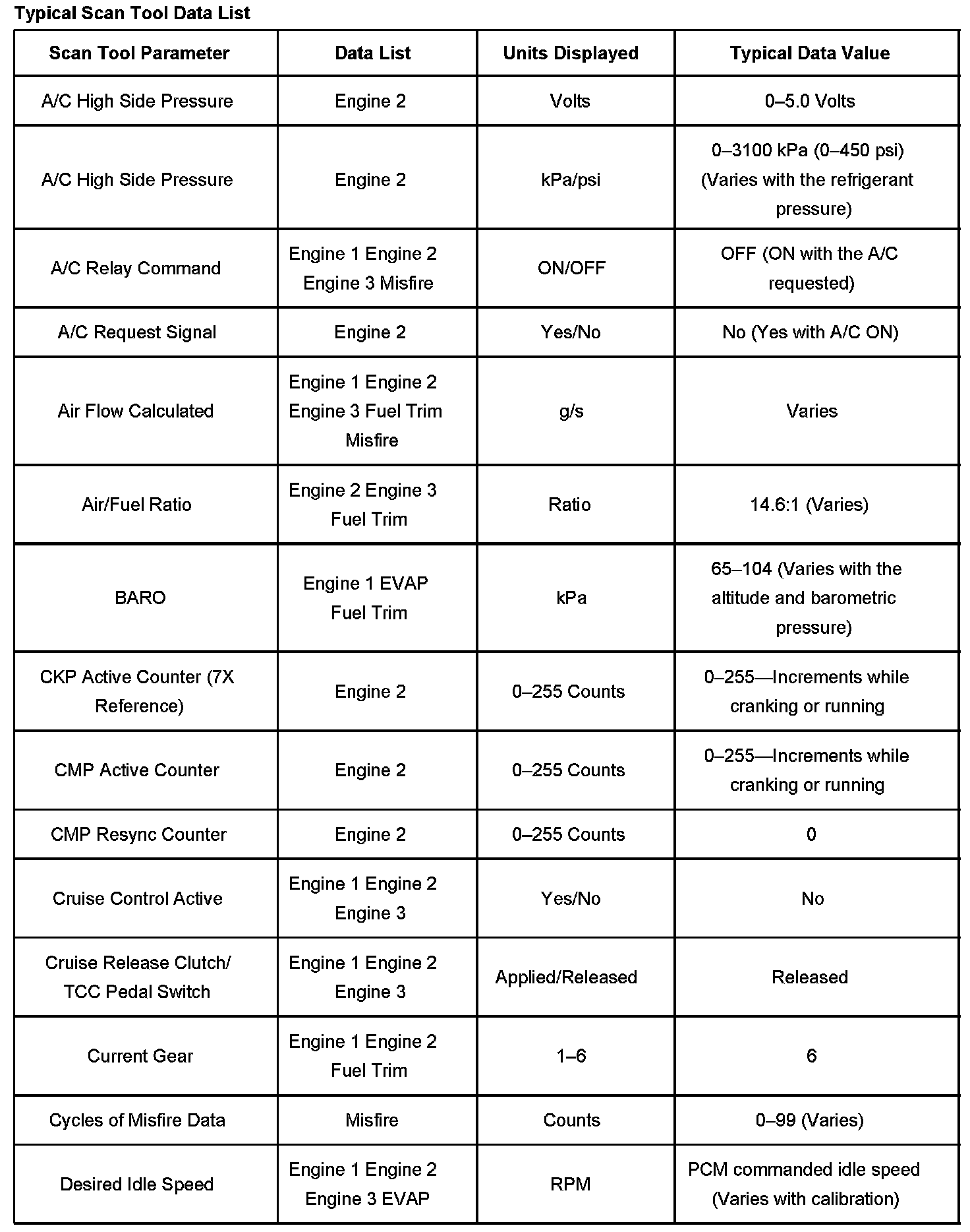 The Engine Scan Tool Data List contains all engine related parameters that are available on the scan tool. The list is arranged in alphabetical order. The parameters in the Typical Scan Data values column represent values that would be seen on a normally running engine.