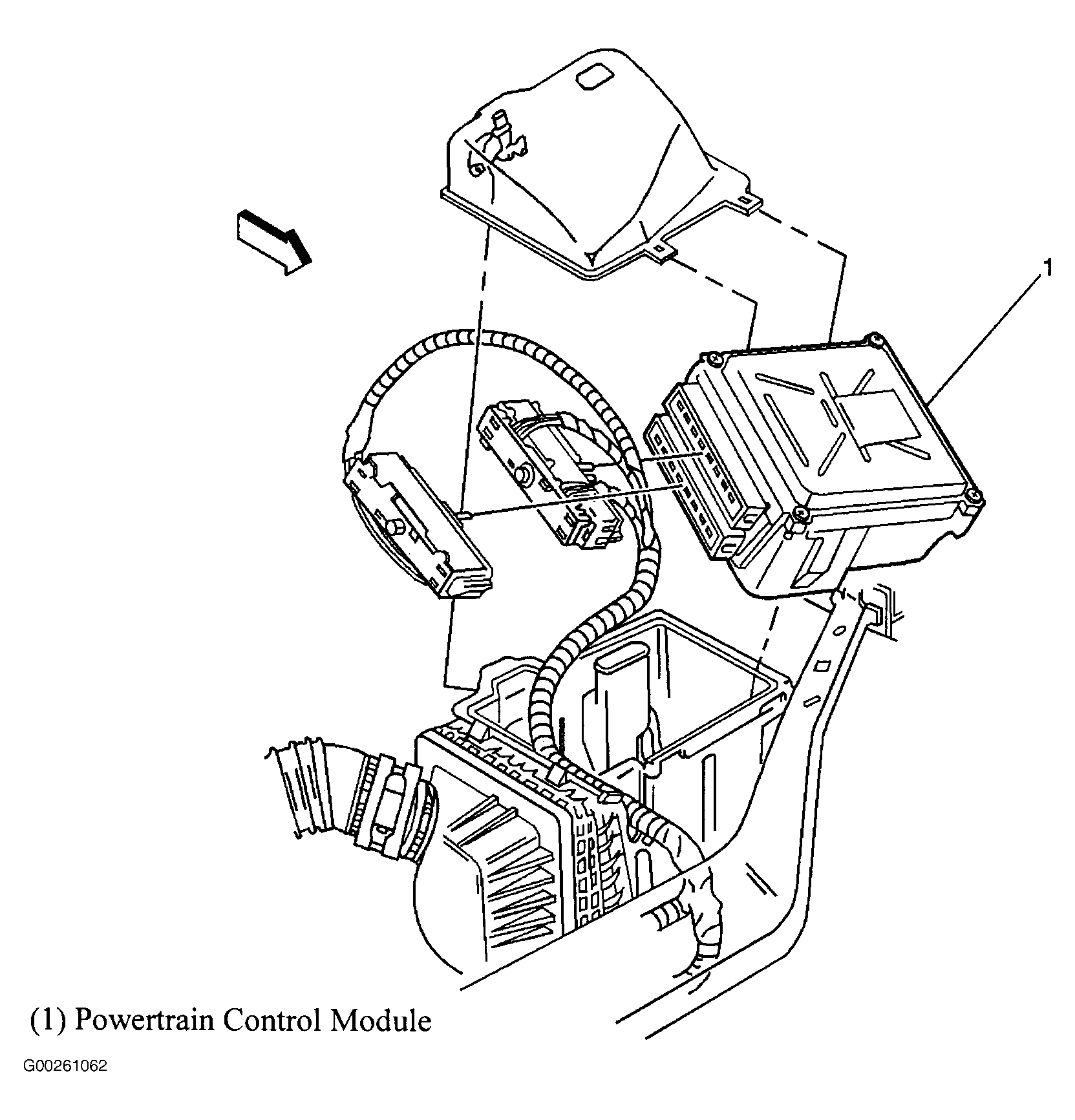 Powertrain Control Module (PCM) At left side of engine compartment, in air cleaner assembly. See Figure.