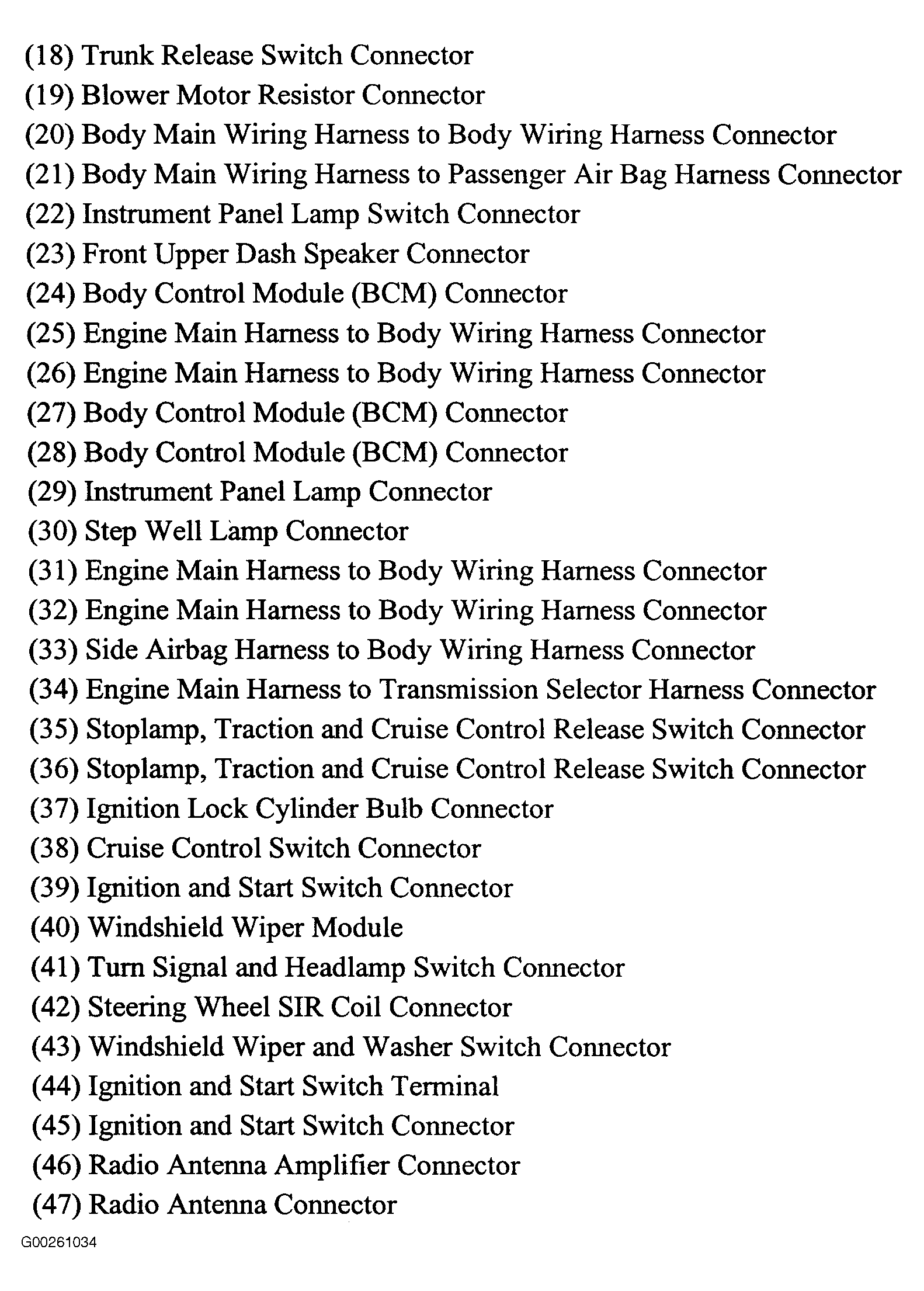 | Body Control Module (BCM) Connector | Below right side of dash. See Figure . |