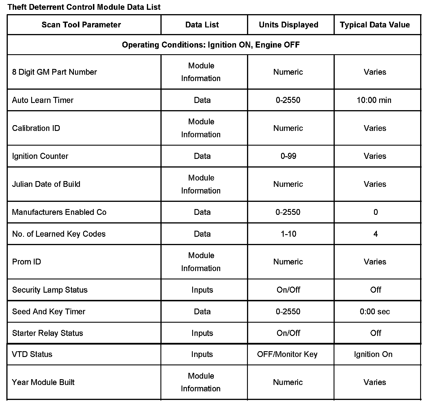 Theft Deterrent Control Module Data List