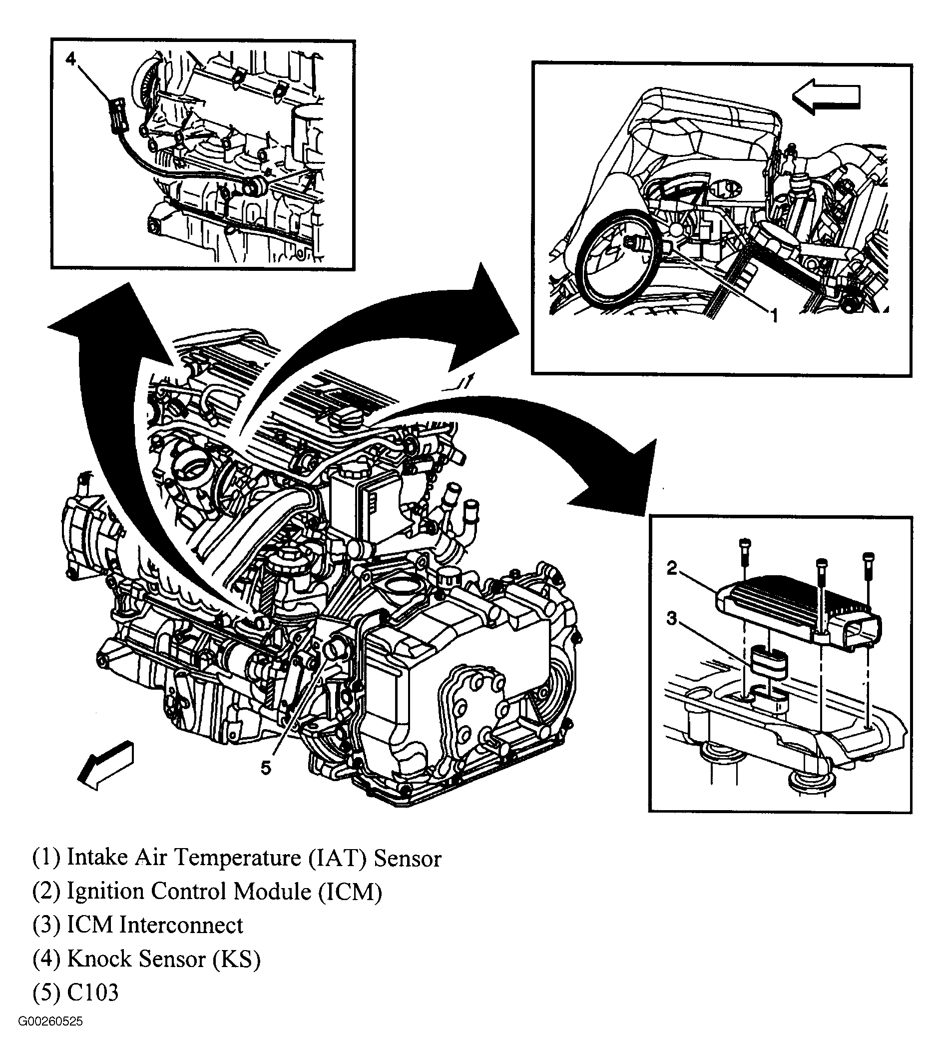 | Ignition Control Module (ICM) | On top left of engine. See Figure . |
