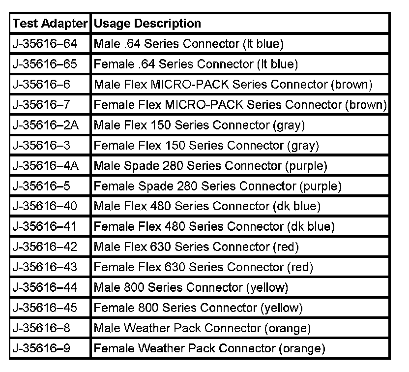 NOTE: Do not insert test equipment probes into any connector or fuse block terminal. The diameter of the test probes will deform most terminals. A deformed terminal can cause a poor connection, which can result in system failures. Always use the J 35616-B Connector Test Adapter Kit or the J 42675 Flat Wire Probe Adapter Kit in order to frontprobe terminals. Do not use paper clips or other substitutes as they can damage terminals and cause incorrect measurements.