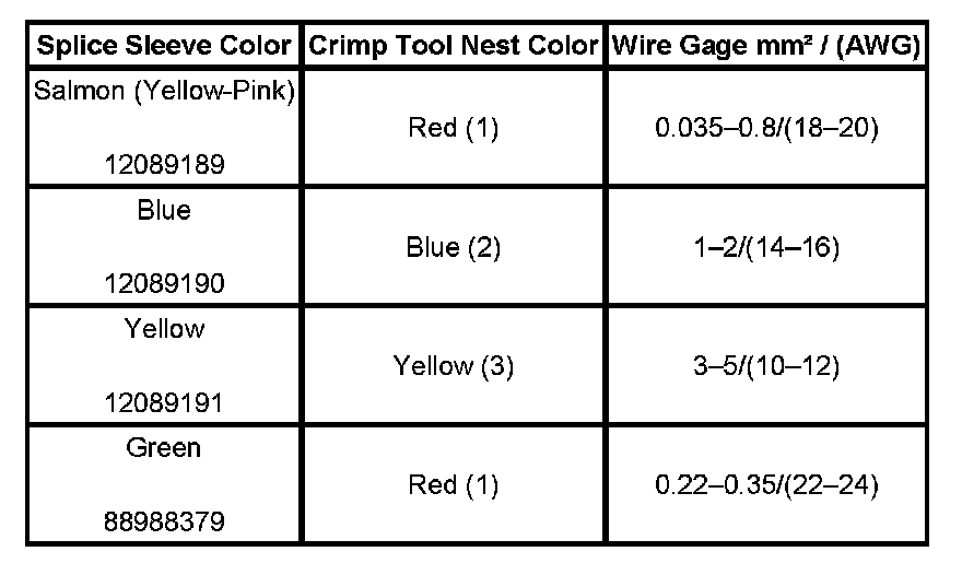 4. Select the proper DuraSeal splice sleeve according to the wire size. Refer to the above table at the beginning of the repair procedure for the color coding of the DuraSeal splice sleeves and the crimp tool nests.