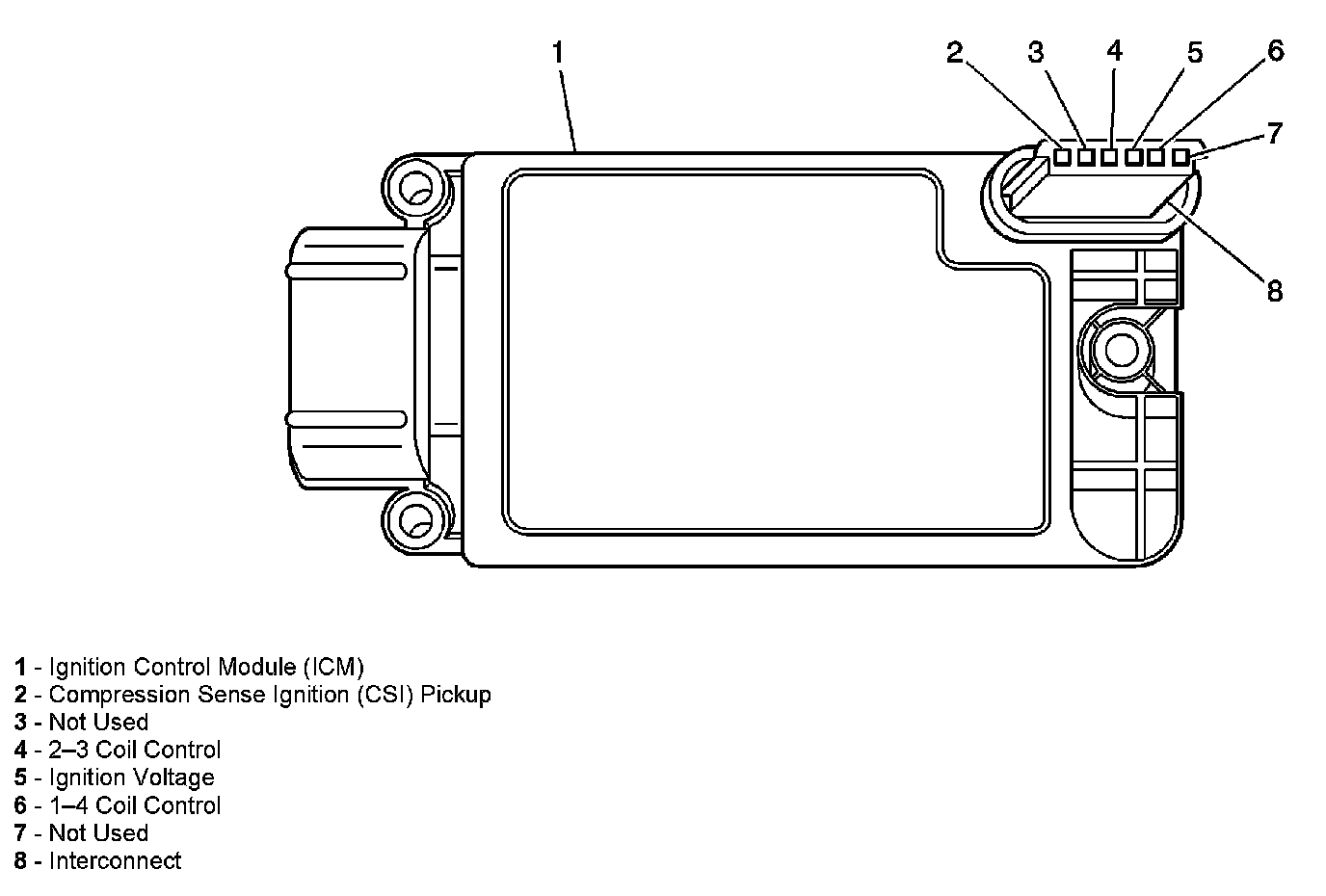 The engine control module (ECM) supplies a signal on each of the ignition control (IC) timing control circuits to the ignition control module (ICM). The ICM fires the correct ignition coil at the correct time based on the signals. The ICM detects if cylinder 1 or cylinder 3 is on the compression stroke by sensing the secondary voltage and polarity of each side of the ignition coil. The ICM detects this voltage with sensing circuitry integrated into each ignition coil. The higher voltage is on the compressing cylinder. This is called compression sense ignition. The ICM provides a synthesized cam signal to the ECM based on these inputs. The ECM uses the cam signal to synchronize fuel injection.