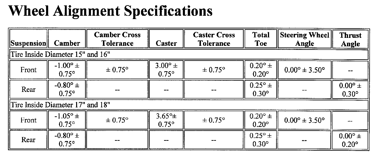 Wheel Alignment Specifications