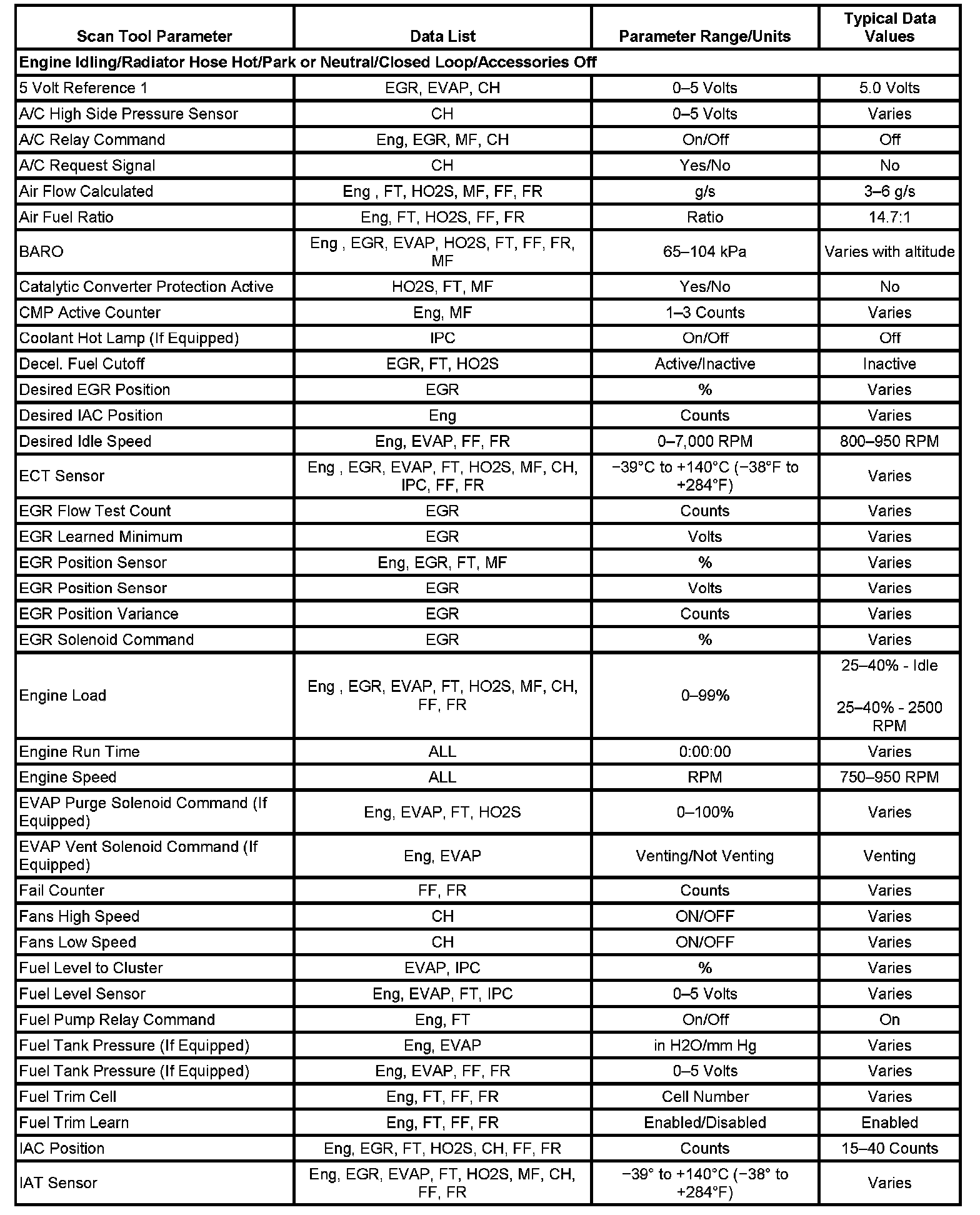 The Engine Scan Tool Data List contains all engine related parameters that are available on the scan tool. The list is arranged in alphabetical order. A parameter may appear in any one of the data lists, and in some cases may appear more than once, or in more than one data list in order to group certain related parameters together.