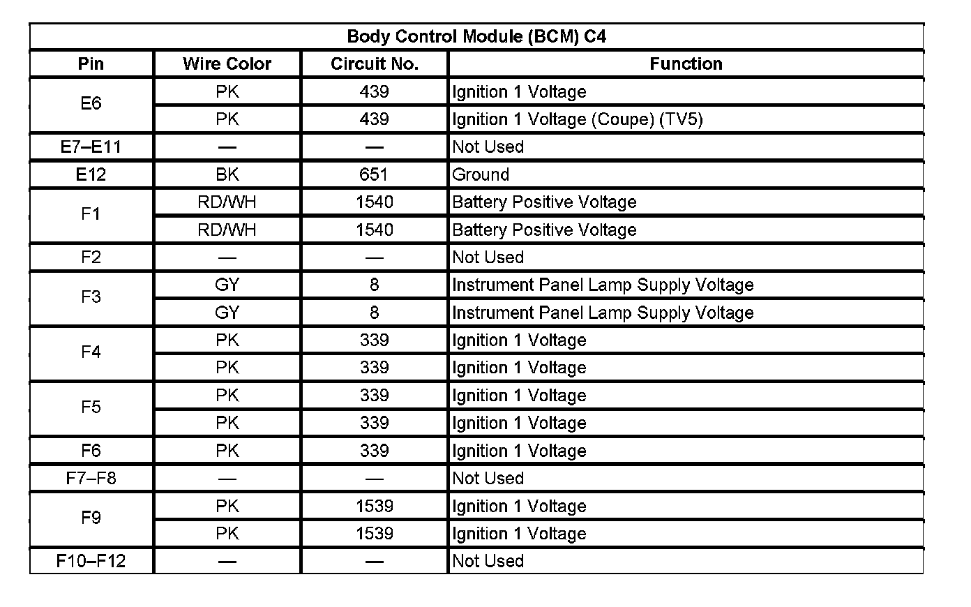 Body Control Module (BCM) C4 (Pin E6 To F12):
