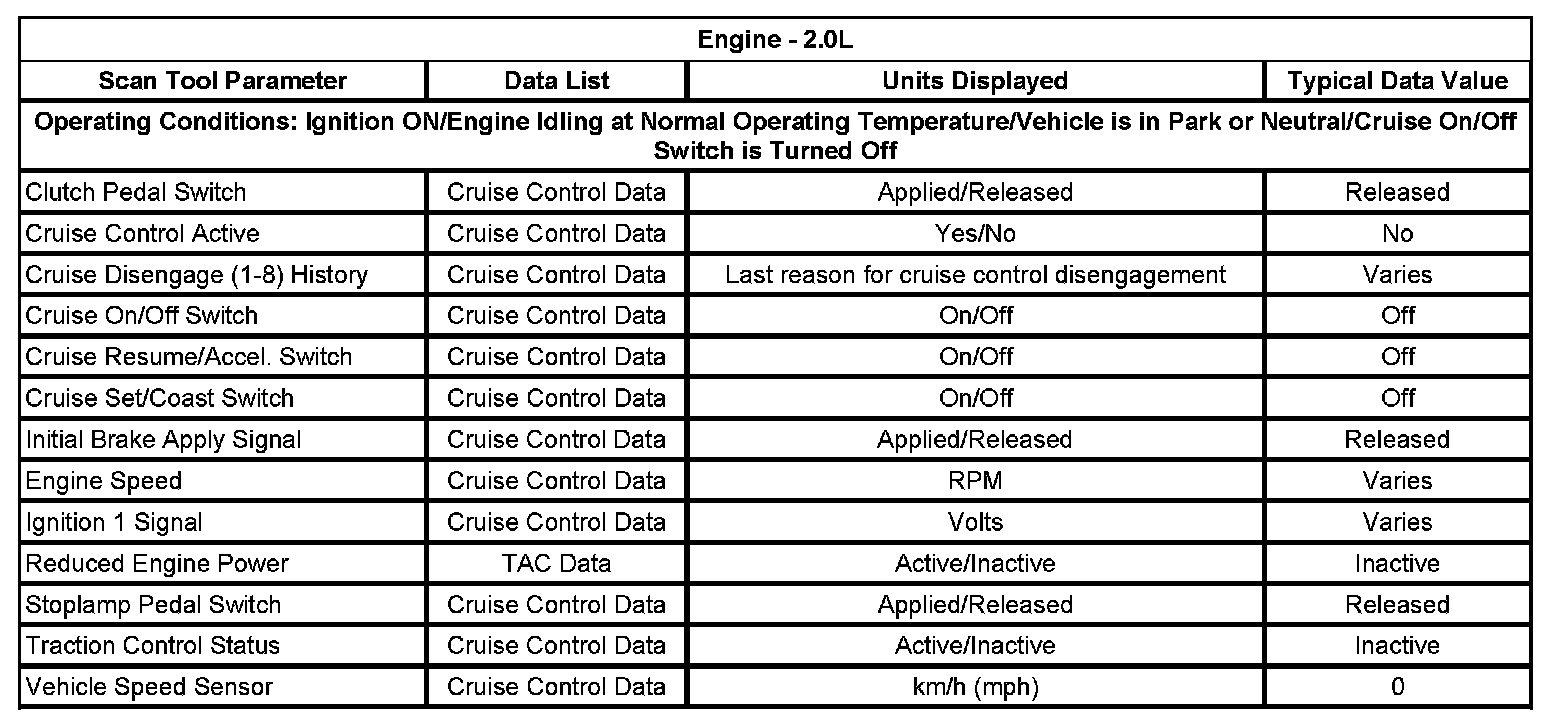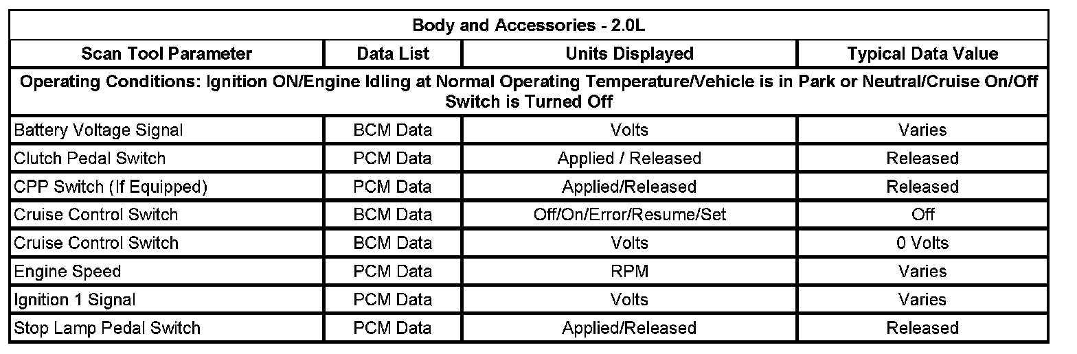 The scan tool data lists contain all of the cruise control related parameters that are available on the scan tool. The parameters in the list are arranged in alphabetical order. The data list column indicates the location of the parameter within the scan tool menu selections.