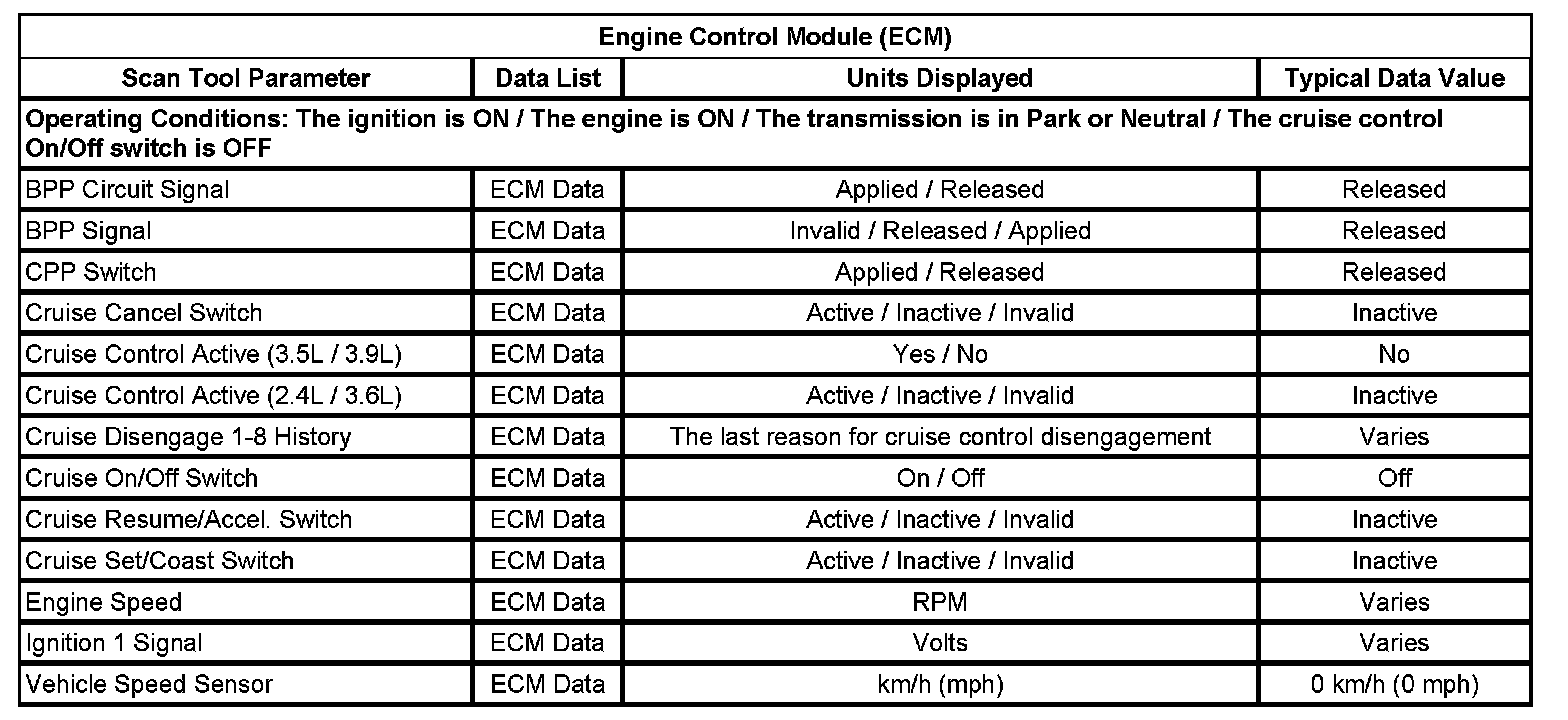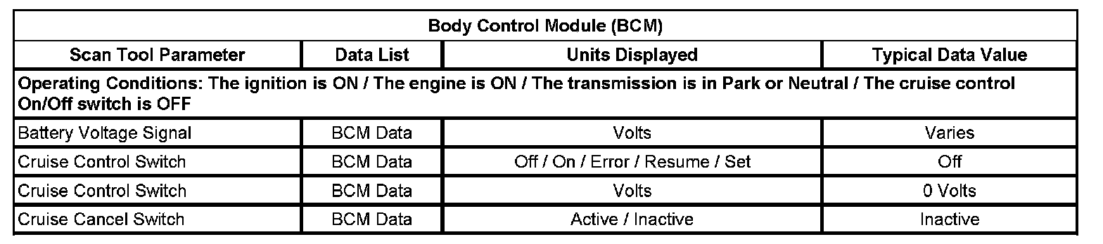 The scan tool data lists contain all of the cruise control related parameters that are available on the scan tool. The parameters in the list are arranged in alphabetical order. The data list column indicates the location of the parameter within the scan tool menu selections.